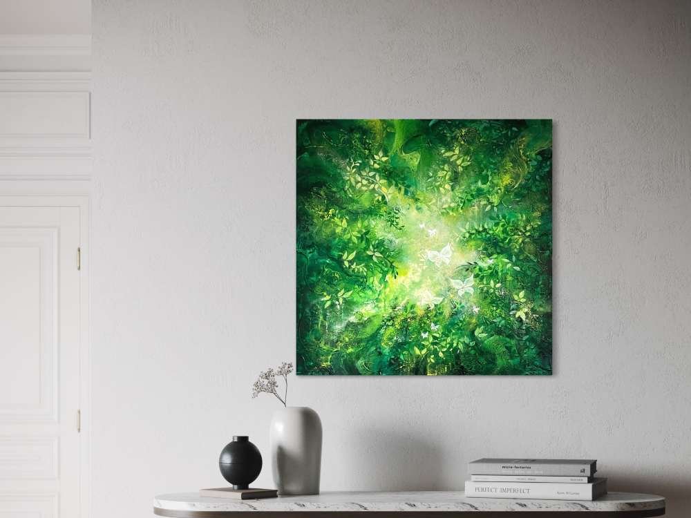 • Kuvaus:  Akryylimaaleilla/sekatekniikalla toteutettu. Reunat maalattu kuvion mukaan. Teoksessa vähän struktuuria. Ripaus kultaista lyöntimetallia.