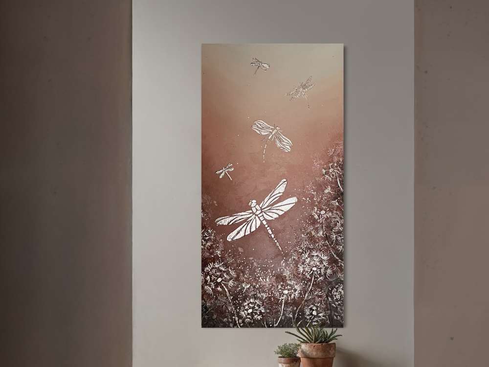 - Kuvaus: Akryylimaaleilla/sekatekniikalla toteutettu. Reunat maalattu kuvion mukaan. Teoksessa vähän struktuuria. Sudenkorennot tehty ruusukultaisella lyöntimetallilla.
